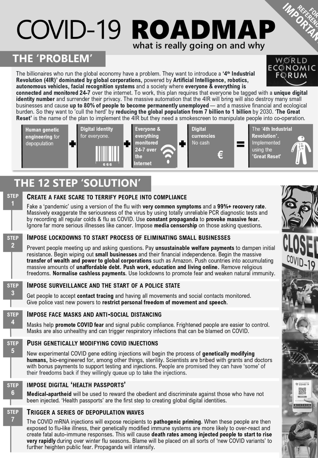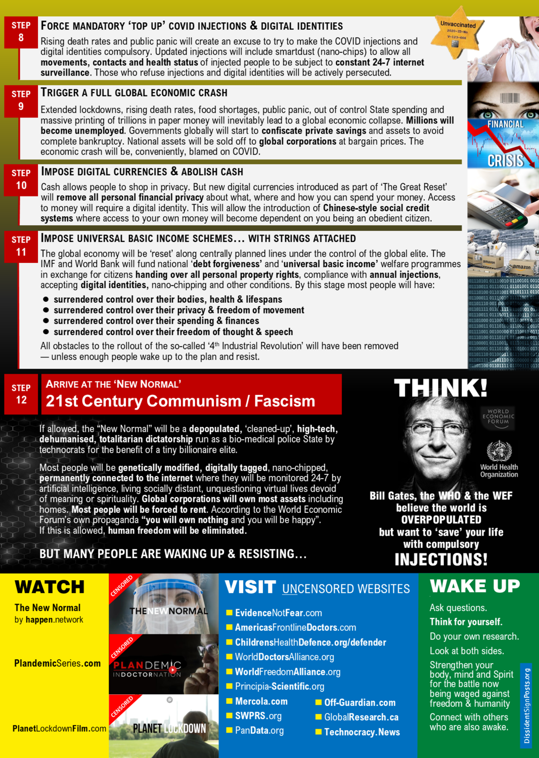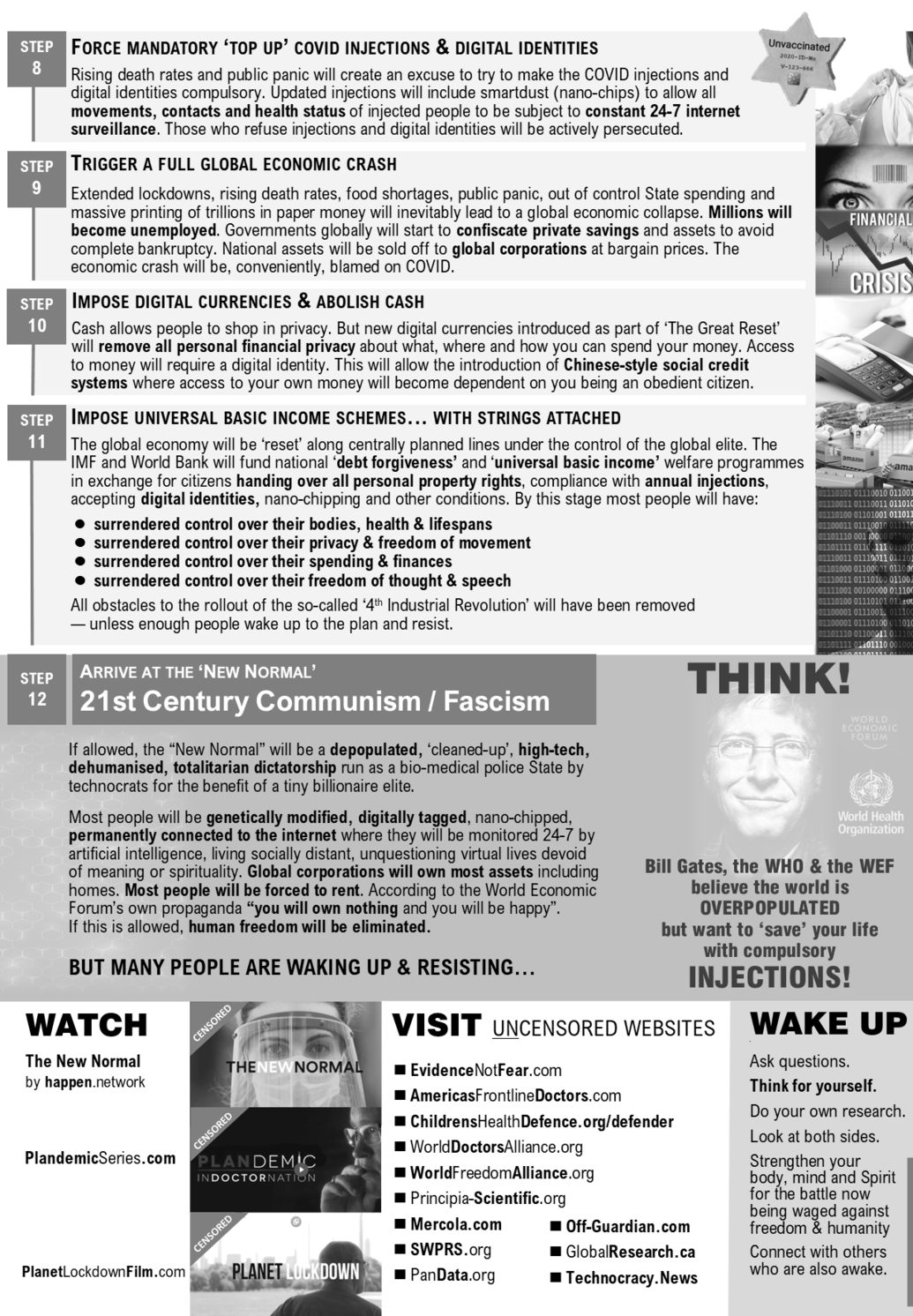 The New Normal. This is a very well researched and professionally produced documentary exposing the true economic and political agenda behind the COVID smokescreen. This has been banned by YouTube and Facebook (of course). Back-up copies are available here, here and here.